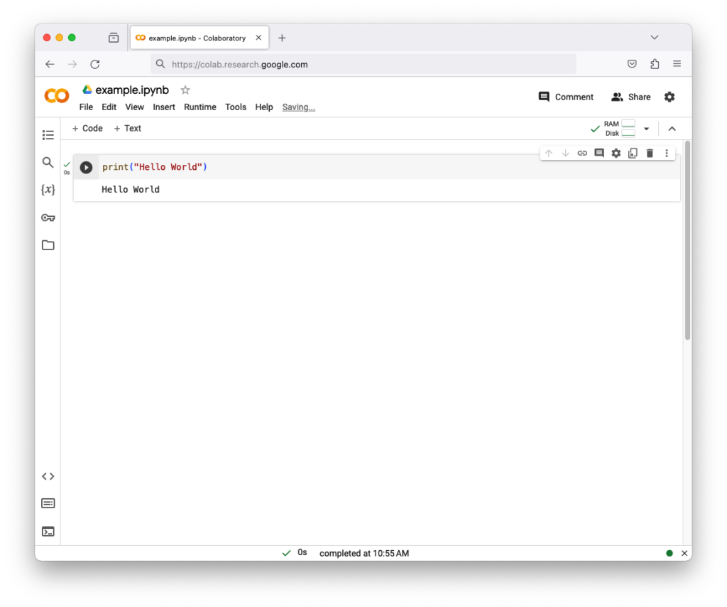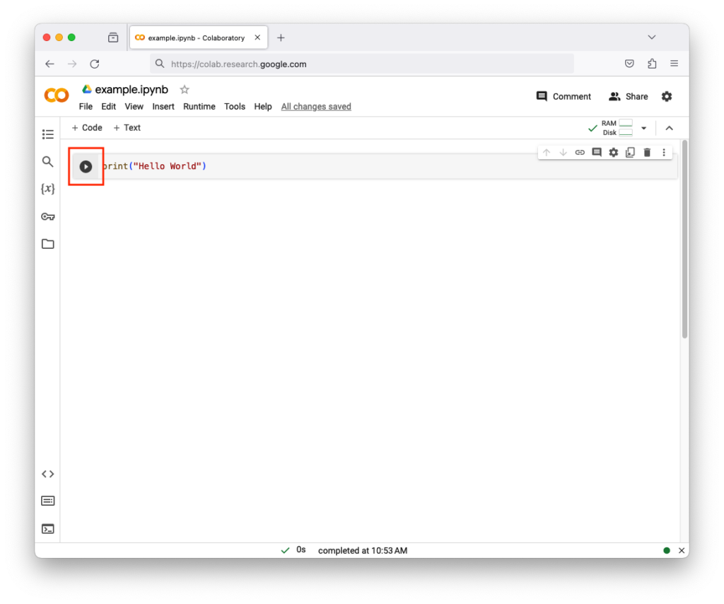 In the top-left corner, the + Code button adds code snippets to the interactive document. The code snippets have a right arrow symbol. Type print("Hello world") and click on that arrow
