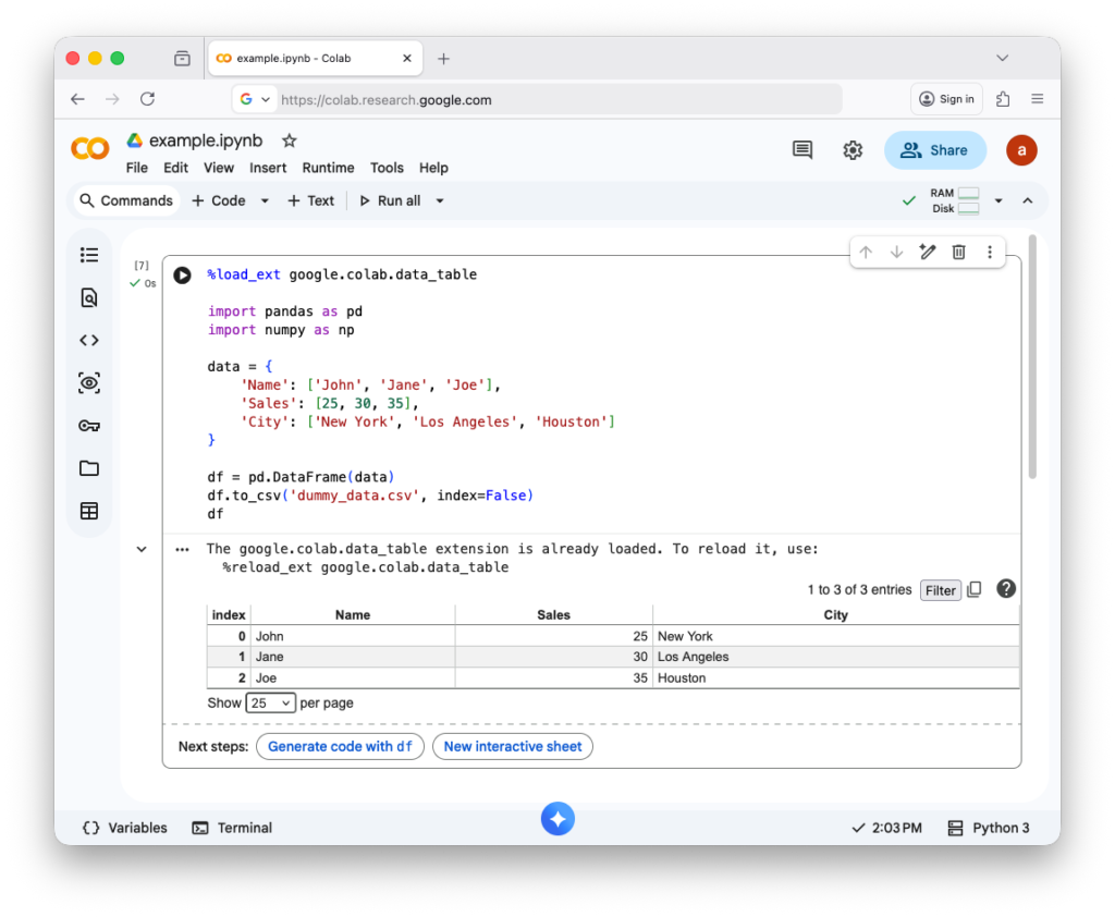 Colab Extensions are extra tools or add-ons that enhance Google Colab’s functionality beyond its default features. They help you work faster, explore data better, and customize your notebook experience. google.colab.data_table is a module in Google Colab that lets you display pandas DataFrames as interactive tables inside a notebook (Some Colab Extensions already loaded in the notebook).