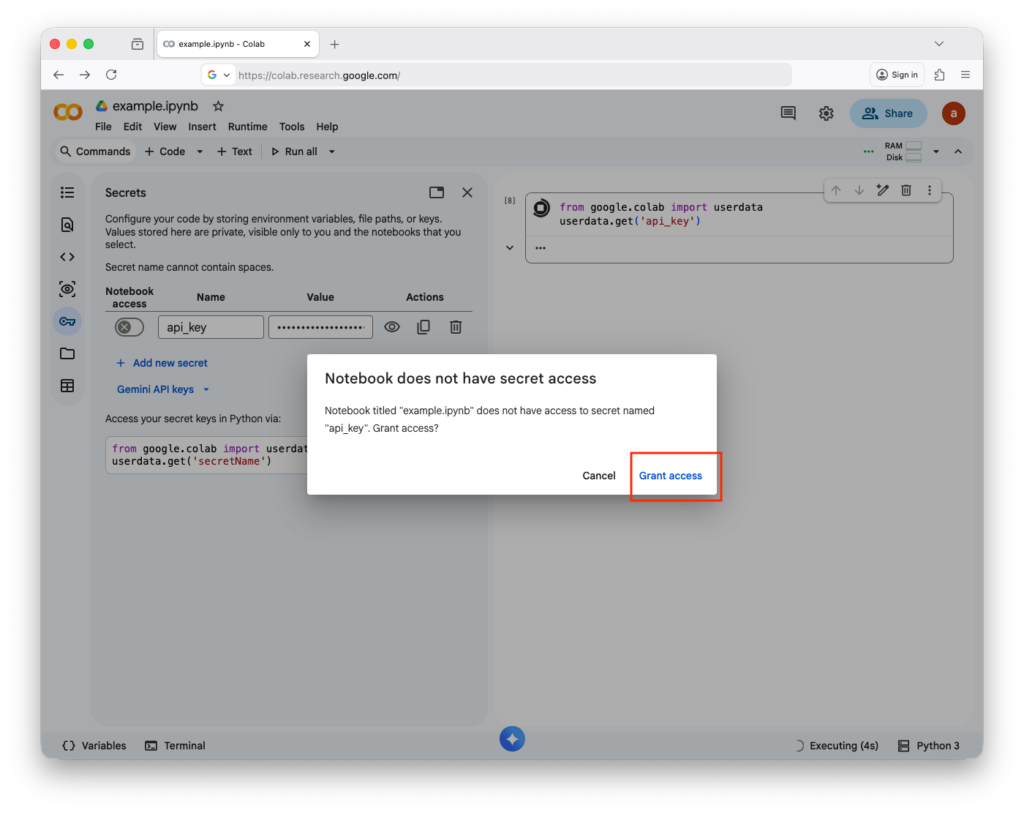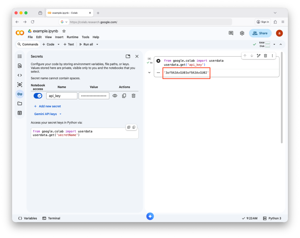 To securely access saved secrets (like API keys) in Google Colab without putting them directly in your code, use google.colab.userdata. It helps protect sensitive information when sharing notebooks.