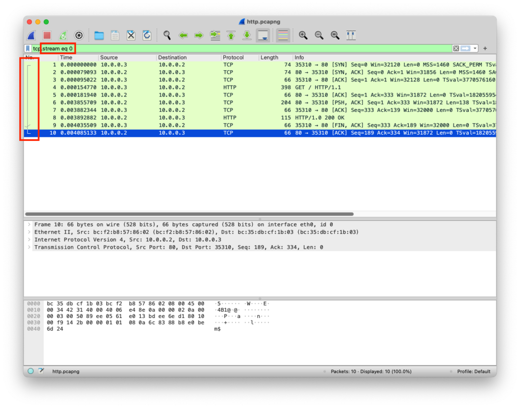 | Network Layer | IP | Packets | GET / HTTP/1.1\r\nHost: 10.0.0.2\r\nUser-Agent: Mozilla/5.0 (X11; Linux x86_64; rv:109.0) Gecko/20100101 Firefox/115.0\r\nAccept: text/html,application/xhtml+xml,application/xml;q=0.9,image/avif,image/webp,*/*;q=0.8\r\nAccept-Language: en-US,en;q=0.5\r\nAccept-Encoding: gzip, deflate\r\nConnection: keep-alive\r\nUpgrade-Insecure-Requests: 1 | Src Port: 35310 Dst Port: 80 | Src IP: 10.0.0.3 Dst IP: 10.0.0.2 | |