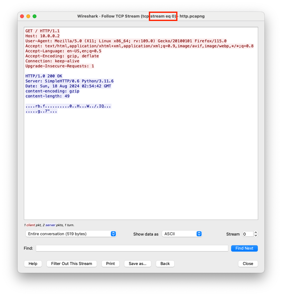 | Application Layer | HTTP | Data | HTTP/1.0 200 OK Server: SimpleHTTP/0.6 Python/3.11.6 Date: Sun, 18 Aug 2024 02:54:42 GMT content-encoding: gzip content-length: 49 <HTML><h1>Hello World!</h1></HTML> |